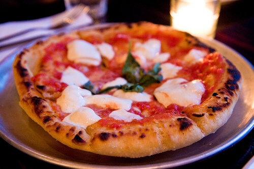 The end product is a concerto of contrasting textures and flavors. The blistered crust is simultaneously chewy and crispy, yet it also retains an ethereal airiness. The misshapen lumps of nicely salty, bone-white melted mozzarella serves as a foil to the zingy crimson tomatoes, while oil adds a smidgen of savory depth—well, fat. The sum is a pizza so beguiling, so unusual, that you won’t even think about your waistline as you reach for another piece, then another.