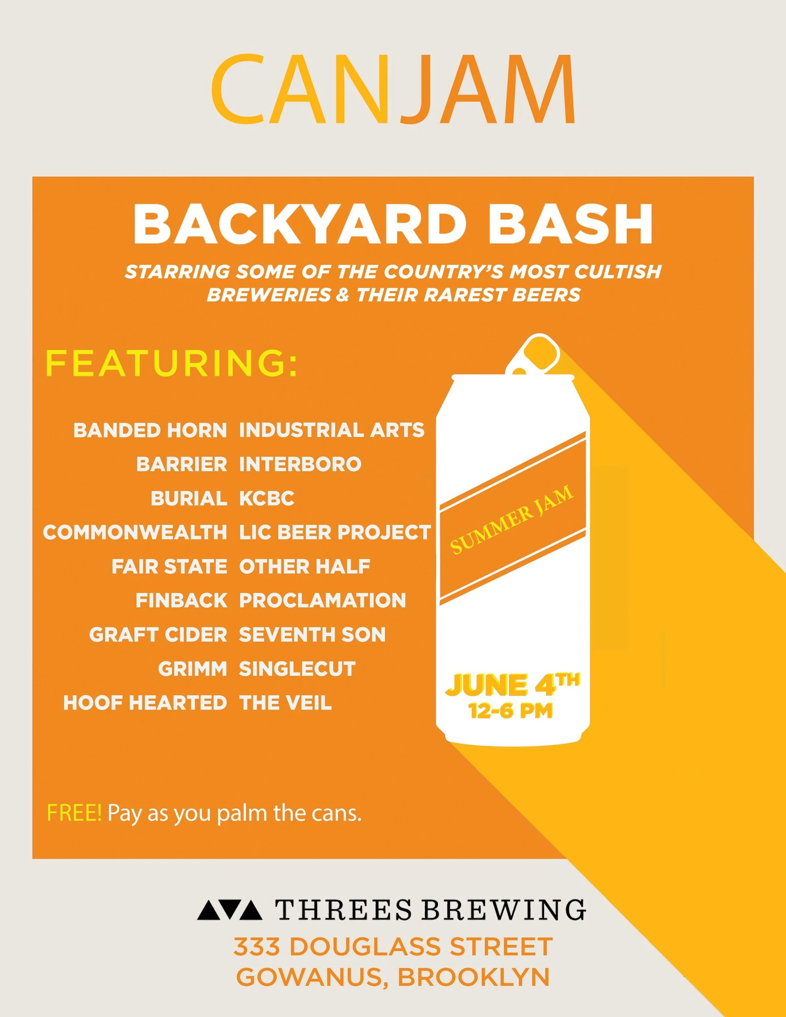 WHAT: Can Jam Summer Edition WHERE:Threes Brewing (333 Douglass St.), Gowanus, Brooklyn WHEN:Sunday, June 4, 12 p.m.– 6 p.m.COST: Free to attend. Pay as you palm the cans. FACEBOOK LINK: Right here.