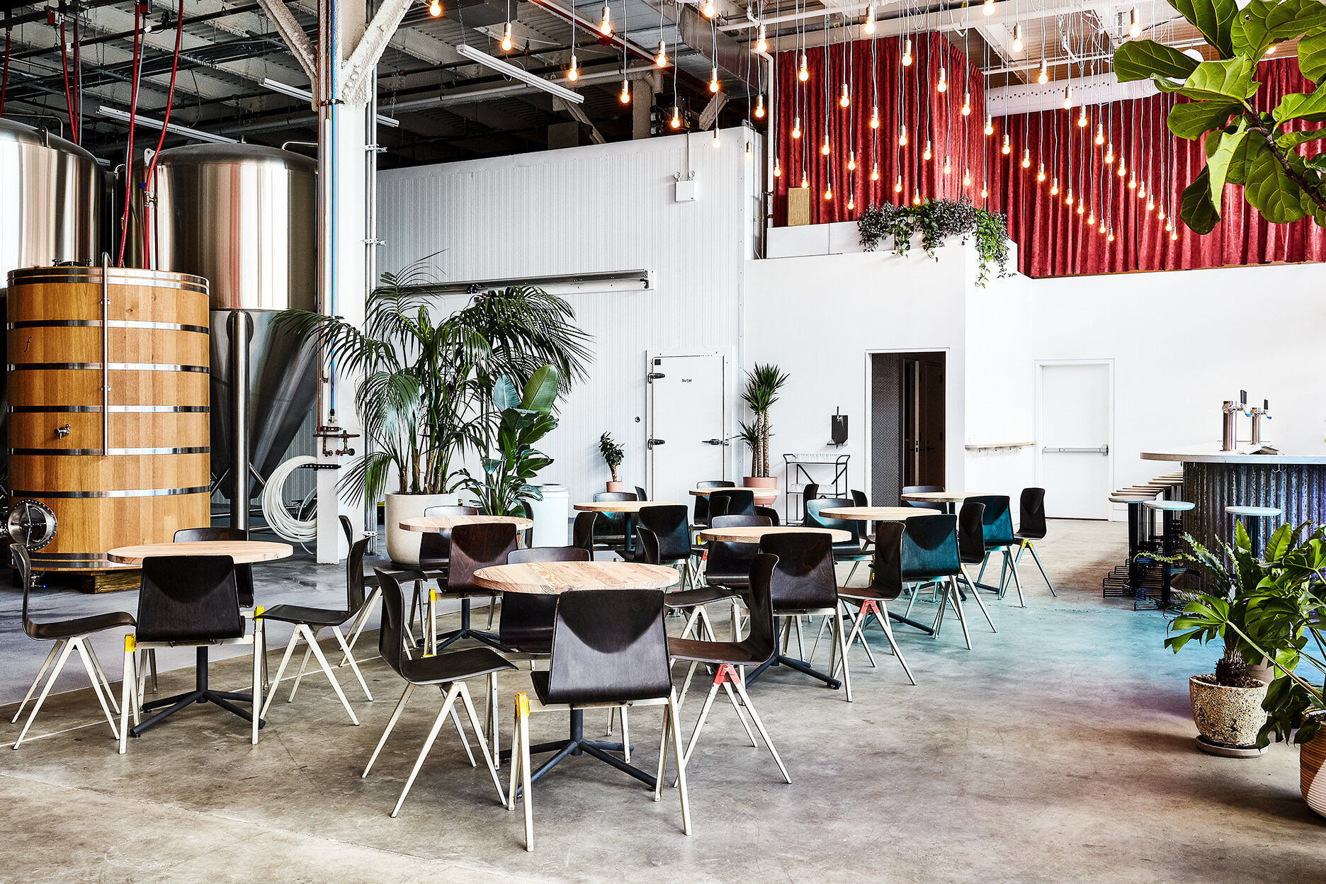 The sunny and soaring white-walled brewery, located on a busy stretch studded with artist studios, is the crystallization of a singular vision. The gallery-sleek space—7,500 square feet in full—features foudres and stacked barrels as design elements, complemented by tropical foliage, towering red-velvet curtains and canopy of dangling light bulbs. There’s custom-designed bathroom wallpaper and Middle-Eastern restaurant Samesa doling out lentil-pistachio dips, chicken shawarma and salad slicked with harissa-date vinaigrette, best paired with the facility’s central focus: oak-aged sours, some components older than three years, a wide range ready to drink on day one.