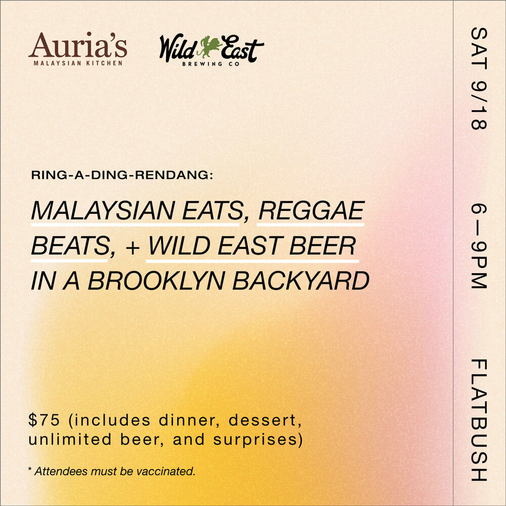 This afternoon and evening, we're returning to Auria's private backyard for a celebration of beer and Malaysian food that's 10 years in the making. We're going to eat spinach and chickpea fritters with mango sambal, beef rendang with butterfly pea coconut rice, and pandan coconut candy for dessert. (There will be a vegetarian option as well. Please let us know after purchasing a ticket.)