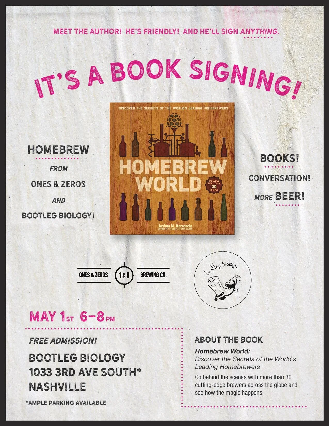 Hello, Nashville! If you're going to be down in Nashville for the Craft Brewers Conference, I'll be signing books at Bootleg Biology alongside Ones & Zeros Brewing. Here's the link to the Facebook event page.
